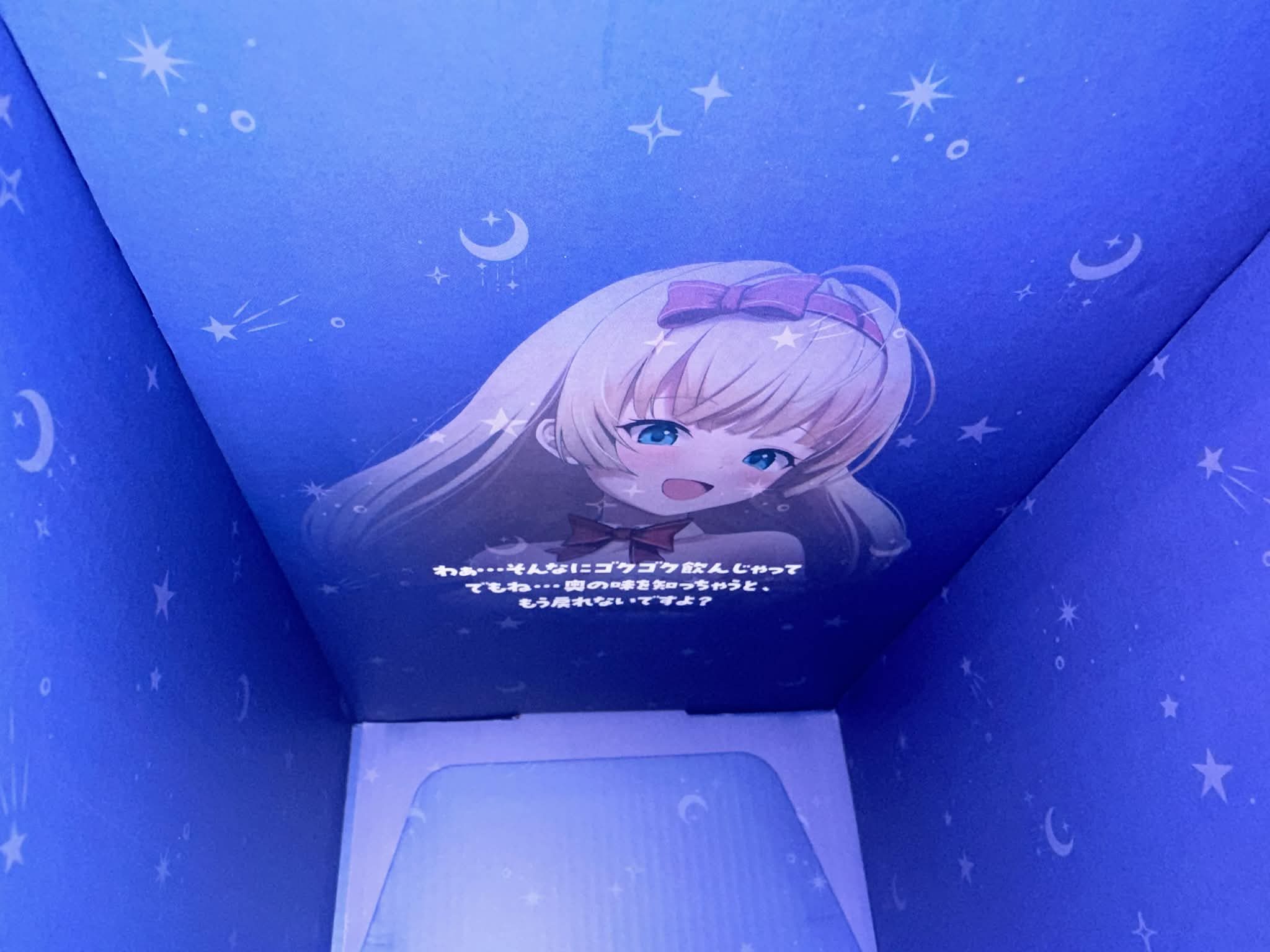 Although the inside of the box is relatively plain, there is one more piece of character art. The text roughly translates to, “Wow… even if you gulp it down like that… once you get to know the deep flavor, there’s no going back, you know?”